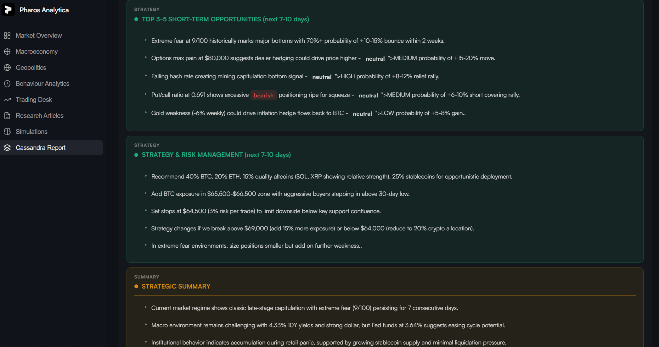 The Cassandra Report is Pharos Analytica’s flagship intelligence synthesis — a six-pillar scoring model that fuses macro regime, derivatives structure, capital flows, on-chain signals, sentiment architecture, and geopolitical risk into a single probabilistic conviction framework. Updated continuously. Delivered with scenario-based action playbooks. This is the brief that institutional desks build in-house for millions — and Pharos delivers it to your screen.